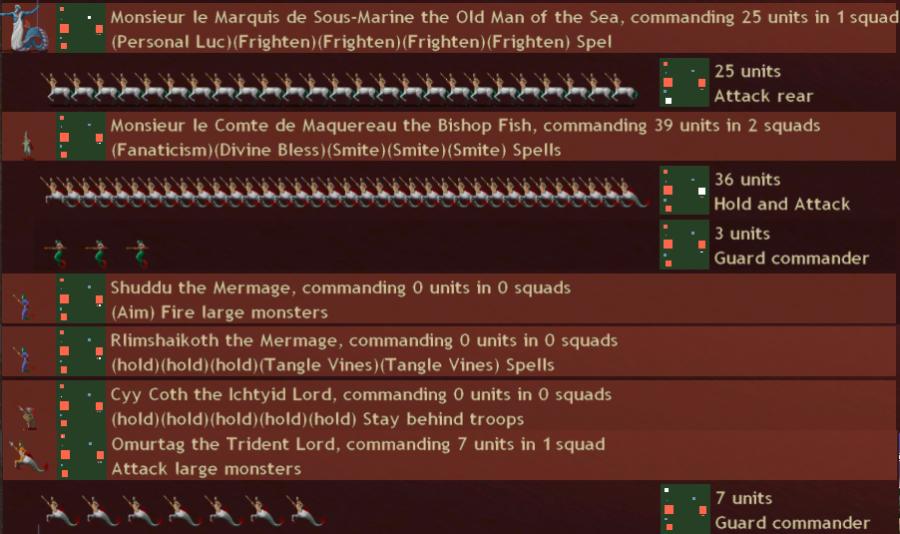 Turn files: Attachment 9575 Big day is finally here! It's so exciting, you bring a nation into this world, try to raise him right, hope you've given him all the tools he needs to make it. But nothing can prepare you for that first day of mortal combat. They grow up so fast! Zee attack vill proceed as planned. Nothing fancy, just a textbook delayed ichtycentaur charge, supported by Tangle Vines & Frighten spam. An Air-random mermage has been given the Piercer; he'll cast Aim on his square, improving the accuracy of the Tanglers, and be set to Fire Glug. Attachment 9576 Oh wait, maybe something a little bit fancy. Our champion approaches...sing it with me! Attachment 9578 Dah....dah! Dah-dah, dah dah dah. Dah! Dah! Dah! Dah-dah dah dah, dah-dah dah dah dah! (chime!) He slices! He dices! He makes calamari fritters in under 2 minutes! Yeah, I'm gonna be in a great mood all day. He'll start the battle berserk, so to keep him from joining combat immediately I'm going to place him in the back corner with a few ichtycentaurs set to guard commander. They'll keep up with ol' Omurtag as he immediately charges into the fray, and get a boost to their morale from the Horn of Valor he'll now be tooting. Since Omurtag is sacred, I'm going to have the Prophet start the battle off with a Divine Blessing, which will give Omurtag a slight boost to his defense, which otherwise is being sapped by the berserk. The Prophet will then proceed with other holy incantations, boosting our morale, and hopefully paralyzing our 8-legged foe. The remaining ichtycentaurs will be split between the front line with Hold & Attack orders, and in the other back corner with Attack Rear orders. As mentioned, hopefully he won't notice my little buildup on his boarder, but even if he does, he'll probably let me take this province uncontested to see what I have. I recruit a bunch more ichtycentaurs to replenish any upcoming losses, send my siege forces in pursuit of the spearhead, and sneak 007's stealthy sappers along with the main force. Additionally, I order another Capricorn. My scout network has reached the Atlantan capital: he has ~40 Reef Warriors, War Lobsters and Ichtyids in defense, led by a King of the Deep. Seems he's stocking up on siege troops to lay the death blow on R'lyeh. Attachment 9577 |