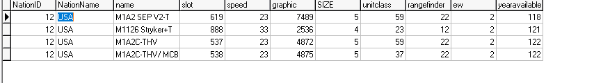 Lots of numbers that don't mean anything to the average player but the easiest way to read these is to look at the name of the unit and the number to it's left is the Icon number used in the OOB's (665,52):{6703, -1}, // 492. PE-2 ***REVISED winSPMBT v15 (727,58):{6765, -1}, // 554. Fairey Firefly *******REV winSPMBT v15 (1398,56):{7548, -1}, //1148. SAAB 17 (Sweden) REVISED winspmbt V15 (1836,57):{8406, 8407}, //1549. M48 (Green) ****Revised WinSPMBTv15 (2127,74):{8920, 8921}, //1808. Pz-IV(skirts) ***REVISED winSPMBT v13-corrected V15 (3021,73):{4964, 4965}, //2630. K2 **NEWWinSPMBTv3.5 ****REVISED_winSPMBT v15 (3109,66):{5115,-1}, //2715. Il-28/B-5 Beagle (green camo) **RevWinSPMBT v15 (3275,57):{5273, -1}, //2873. Curtiss P-36 Hawk REV winspmbt v15 (3597,88):{5770, -1}, // 3170 SAAB T-18 - Sweden ****NEW winSPMBT v9 **REV winSPMBT V15 (3615,183):{5788, -1}, // 3188 I-L2 Polish ****NEW winSPMBT v9 ***REVISED winSPMBT v15 (5402,65):{12696, 12697}, //4896. Dragor LVC *********NEW winSPMBT v15 (5406,74):{12700, 12701}, //4898. K2 Winter-South Korea *********NEW winSPMBT v15 (5407,79):{12702, 12703}, //4899. MTVR MAS Truck with WS summer *********NEW winSPMBT v15 (5408,80):{12704, 12705}, //4900. MTVR MAS Truck with WS winter *********NEW winSPMBT v15 (5409,80):{12706, 12707}, //4901. MTVR MAS Truck with WS desert *********NEW winSPMBT v15 (5410,70):{12708, 12709}, //4902. Type 74F MR Japan *********NEW winSPMBT v15 (5411,76):{12710, 12711}, //4903. Bristol Sycamore / S-51 *********NEW winSPMBT v15 (5412,67):{12712, 12713}, //4904. HOK-1 Huskie *********NEW winSPMBT v15 (5413,68):{12714, 12715}, //4905. Ariete PSO/WAR *********NEW winSPMBT v15 (5414,73):{12716, 12717}, //4906. Ariete PSO/WAR Dozer *********NEW winSPMBT v15 (5415,72):{12718, 12719}, //4907. Ariete PSO/WAR Camo *********NEW winSPMBT v15 (8046,89):{17780, 17781}, //7438. Ariete Desert ********NEW winSPMBT v5.5 ***REV winSPMBT v15 (8047,93):{17782, 17783}, //7439. Ariete Winter camo ********NEW winSPMBT v5.5 ***REV winSPMBT v15 (8048,94):{17784, 17785}, //7440. Ariete Winter White ********NEW winSPMBT v5.5 ***REV winSPMBT v15 (8099,94):{17882, 17883}, //7489. ABRAMS SEP V2+ camo ********NEW winSPMBT v10******REV winSPMBT v15 (8100,96):{17884, 17885}, //7490. ABRAMS SEP V2+ winter ********NEW winSPMBT v10******REV winSPMBT v15 (8101,96):{17886, 17887}, //7491. ABRAMS SEP V2+ desert ********NEW winSPMBT v10******REV winSPMBT v15 (8593,88): {18562, -1}, //7962 TU-2 green ********NEW winSPMBT v10 ***REV winSPMBT v15 (8594,87): {18563, -1}, //7963 TU-2 camo ********NEW winSPMBT v10 ***REV winSPMBT v15 (8595,92): {18564, -1}, //7964 TU-2 winter camo ********NEW winSPMBT v10 ***REV winSPMBT v15 (8692,62): {18657, -1}, //8057 C14 Truck ********NEW winSPMBT v15 (8693,71): {18658, -1}, //8058 MTVR ammo Truck green ********NEW winSPMBT v15 (8694,72): {18659, -1}, //8059 MTVR ammo Truck winter ********NEW winSPMBT v15 (8695,72): {18660, -1}, //8060 MTVR ammo Truck desert ********NEW winSPMBT v15 (8696,67): {18661, -1}, //8061 MTVR Truck green ********NEW winSPMBT v15 (8697,68): {18662, -1}, //8062 MTVR Truck winter ********NEW winSPMBT v15 (8698,68): {18663, -1}, //8063 MTVR Truck desert ********NEW winSPMBT v15 (8699,71): {18664, -1}, //8064 MTVR Truck open green ********NEW winSPMBT v15 (8700,72): {18665, -1}, //8065 MTVR Truck open winter ********NEW winSPMBT v15 (8701,72): {18666, -1}, //8066 MTVR Truck open desert ********NEW winSPMBT v15 (8702,69): {18667, -1}, //8067 Large Truck green ********NEW winSPMBT v15 (8703,69): {18668, -1}, //8068 Large Truck winter ********NEW winSPMBT v15 (8704,69): {18669, -1}, //8069 Large Truck desert ********NEW winSPMBT v15 (8898,60): {18955, -1}, //8255 Yak-11 ********NEW winSPMBT v15 (8899,79): {18956, -1}, //8256 F-15 65th Aggressor Squadron Camo*******NEW winSPMBT v15 (8900,68): {18957, -1}, //8257 F-15 Grey Camo ********NEW winSPMBT v15 |