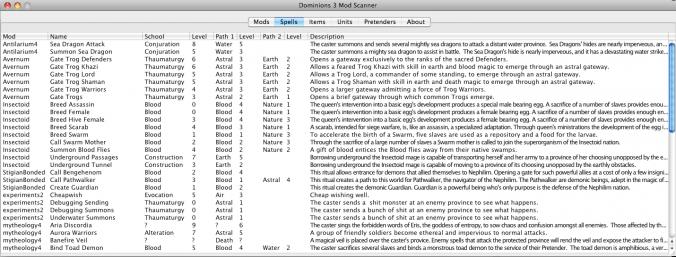 I'm working on a multi-platform desktop application that scans the Mods folder, and lists all the installed "add-on" (mod) spells, items, units, pretenders etc. I'm about 1/2 done, but it already looks like it will be a handy reference too and a complement for Edi's awesome database.