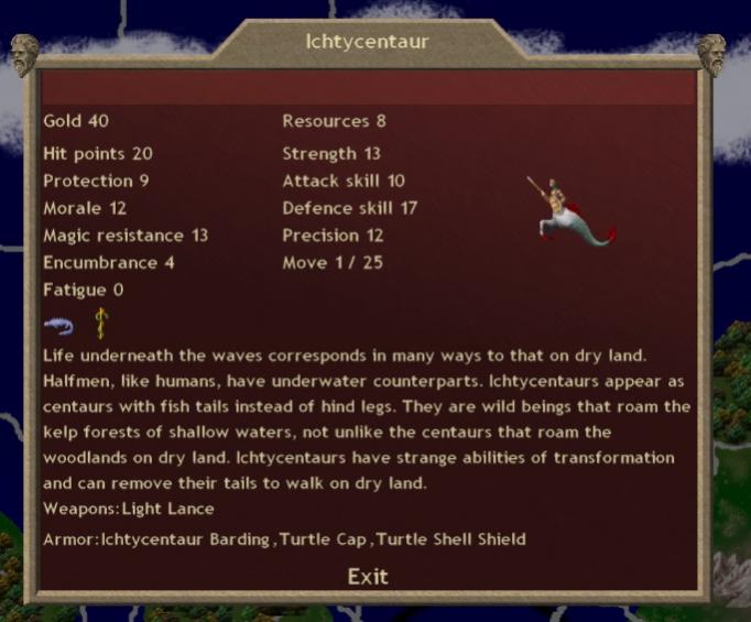 20hps, 17def, First Strike Bonus, amphibious and a 5:1 gold:resource ratio, which allowed me to take Sloth scales (I'll almost always be gold-limited). We'll be recruiting these just about every turn from now on.