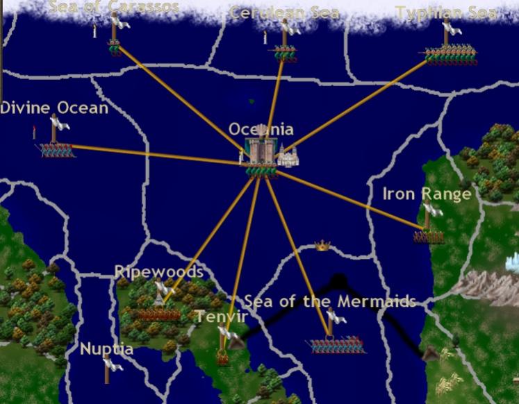 But victory is surely possible. By the game’s rules, I only need 4 capitals to win, which is a relatively low number, and certainly achievable for me since all 3 underwater nations are participating. If it’s going to happen, it’ll be by the following gameplan: