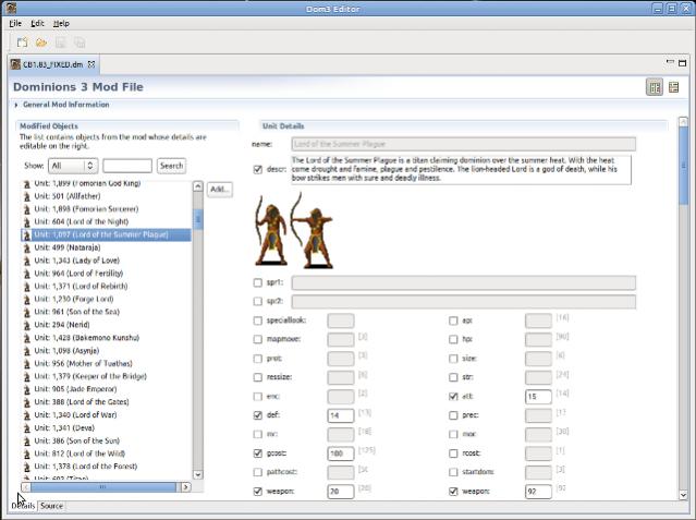 I would like to announce the first release of Dom3Editor. This is a mod editing application that I hope will make it easier to produce mods for Dominions 3. This application is good for both editing and browsing mods. It can show you what has changed in a mod and what the default values are. Here are some of the features: