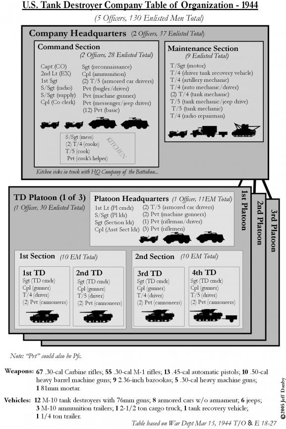 I have this game and have a VERY LONG USA generated Campaign ongoing from North Africa to the end of the war maxed out at 99 battles. Also I've read as much as I can on the war to include the prize of my collection Churchill's 1st Ed. (U.S.) complete set of "The Second World War". Currently reading "The Day Of The Panzer" by Jeff Danby dealing primarily with the U.S. invasion of Southern France. I have sent this on earlier in the week copied from the book so not very readable along with the refs from the military history section in Wash. D.C. they matched up to within 10 men at the Battalion level. For the TD TO&E it could've included the M18 or M36 depending on unit and time frame. These tables reflect what the units used in S. France which is why you'll see the M10. Note the units noted below were also supported by a platoon of M8 SPA as well though not shown in the charts.