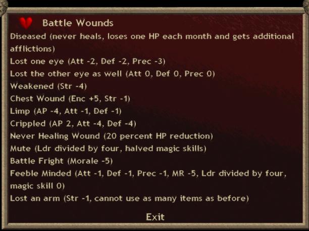 He's Diseased, Blind, Weakened, Chest Wound, Limp, Never Healing Wound, Mute, Battle Fright and Lost an Arm.
