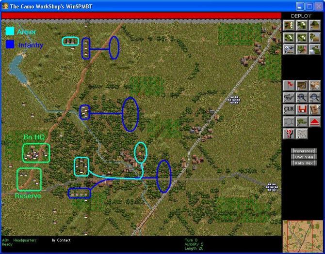 My plan is fairly basic. Two infantry companies will move into the woods in the center of the map near my deployment zone. One will deploy on the north side facing north and northeast. The other company will deploy on the east side of the woods facing roughly east and southeast. They will be supported by one tank platoon and the tank command section. The tanks will deploy on a hill between the two infantry companies, but back away from the edge to avoid ATGM fire. Anyone coming up on the hill will be engaged by the armor and the armor will be in a position to shift support to either infantry company.