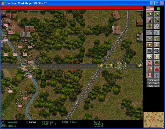 Terrain: Map = 100x100. Lightly wooded terrain with a few low hills. Some single tree hexes does not block LOS. There is one stream running from northwest to southeast. The map is relatively busy with roads. Two roads run from the east to west across the map. One is a straight dirt road all the way across within 150m of the south edge. The other is a more centrally located paved road with curves. There is a generally straight railroad extending from the northern edge of the enemy deployment zone to the southern end of the friendly deployment zone. Roughly parallel to this and 2km to the west is a dirt road. It spends most of it's time in the friendly deployment zone and exits the west central edge of the map. Because of the stream and the number of roads, there are seven bridge hexes. There are about a dozen building clusters scattered about the map, most of them between the deployment zones and along roads.