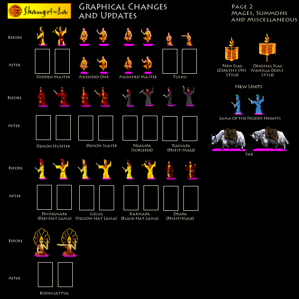 - Sprites tweaked: Overhaul of Shangrilan basic commander (Dmag Dpon), standard-bearer (Dmag Dar), elite heavy infantry (Dmag Hrag), Guardian of the Hidden Valley, and king (Rje). A few more fine tuning tweaks to Bhödpa Horseman and Yak Rider sprites.