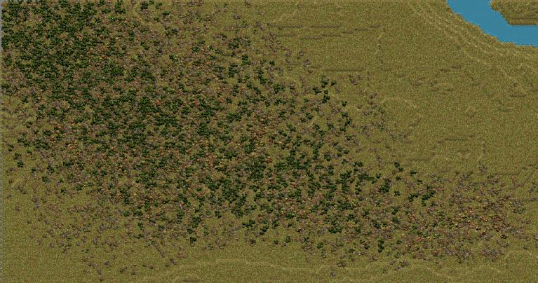 This does show the water colour change and some of the new terrain. That medium-brown field is the new " harvested field" the dark green trees are the coniferous only set but the big change really has to be used to be appreciated fully..... the splatter code that allows you to pick the size of the area you want to right click to fill then how much....it's very much like using a spray gun and it allows terrain to be blended in ways it was not practical before. I personally like around 15 in size and a splatter % around 10...( on a larger map......smaller maps require more subtle touch. **I'm** still learning what this can do ) it builds but allows control of the build and I'll post and example next........hand made map will benefit from this greatly but the I aimed this at working with the Venhola map program .... this Goldap map started out that way