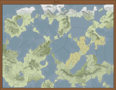 217 provinces, including 32 water. Starting locations are established for 12 nations, 3 of which are underwater. Nearly all water provinces are contiguous, and can reach all parts of the map. Landmasses are separated, mountainous, with many interconnections. Game victory is achieved by controlling 6 of the 16 special victory sites. Two of the 16 sites are underwater, and count double toward victory.