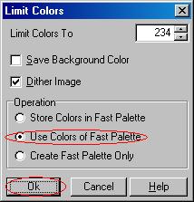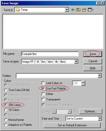 Then you save the picture making sure you select 256 colors and check the box "Use Fast Palette".