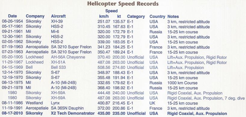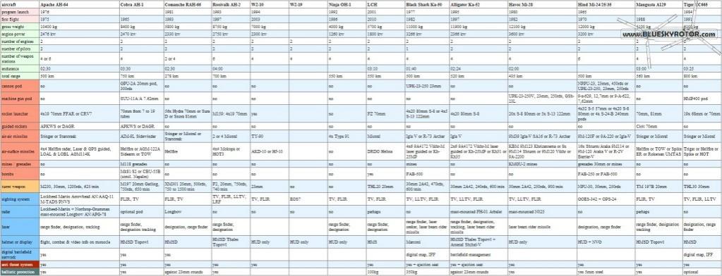 some are just flat wrong... (the first table in your first post above for instance gives a top speed of 411 km/h for the super cobra - this is higher than the world record for a standard helicopter!)
