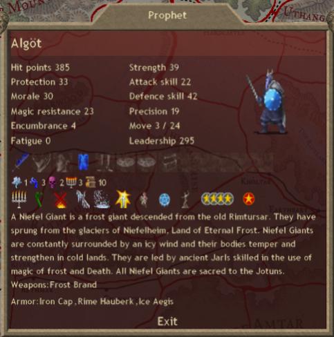 As a bonus, here's a screenshot of my prophet. Bwahaha! (I forgot to finish kitting him out since I got Const 6 and gem income; I prophetised him earlier on and he didn't need much equip. Next turn he'll be even more awesome) Worth noting that he's in a cold 3, dom 9 province, so he has a +129 dominion bonus to his HP, and probably a large hp/stat bonus from cold power (how does that work exactly? Can I find the stats for cold power somewhere?). Plus the rime hauberk in cold 3... Still, he's Prot 33, Def 42, with 5 reinvig and 77 regen.