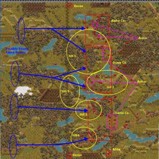 Since I have a little time, I'm going to reevaluate my overall deployment. I've pulled all my armor except my light tanks off line, so I want to make sure I'm not vulnerable as a result of these changes. My ATGs will still cover the road on the left flank and I could move a few tanks back over to Hills 2 or 3 if needed. I need to make sure.