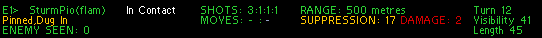 Additional new status information is now shown at the bottom of the screen. If the status is pinned, the status line is yellow, if retreat or worse, it is red. If suppressed more than 1, that is highlighted in yellow and Damage is now shown. In green if 0, otherwise in red.