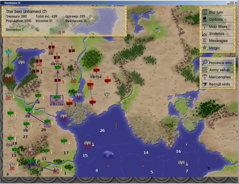 Several plopps move into province 4. One settles and increases dominion there. A couple travel into province 5 and one into province 7. Now enemy plopps move into province 4 and 5 and retakes the provinces. All this happens during one turn. Province 7 is farther away from the enemy capital and survives longer than 4 and 5.