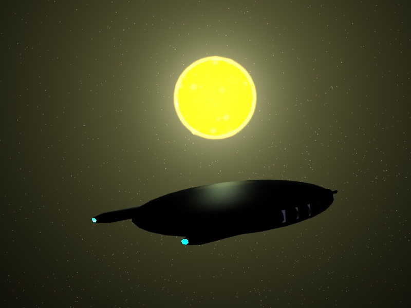 New render! This time its of a frigate. Sorry about the darkness, the camera is facing the light. I mostly wanted to show the sun I made