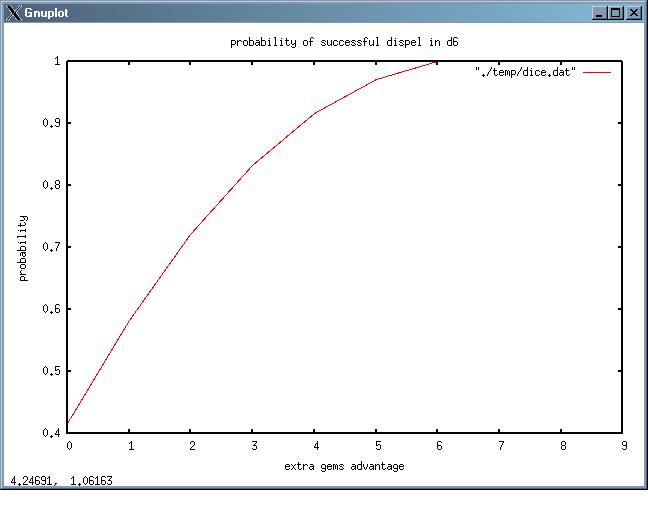 To get an idea of the probability of successful dispel as a factor how many extra gems the dispelling mage is using I simulated things for d6.