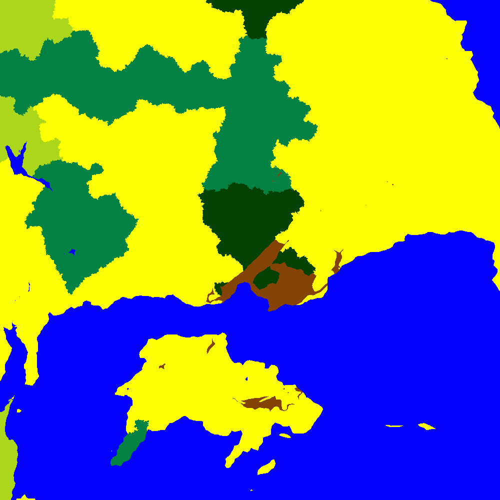 forests (green), farmlands (light green), swamps (dark green), mountains (brown), and water (blue). There should be some wastelands in there, but the algorithm is not quite complete.