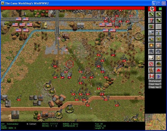 Bridge head being hit by heavy enemy artillery, but mark IVh platoon and engineer platoon rushed across river. Most moved North to support Group 3 in stopping enemy reinforcements. Two flags of G3 turned, but most units in this area are heavily suppressed. The bridge is still up. If it stays up, there are seven more tanks and a core infantry company ready to cross.