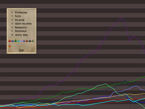 Always good to hear from a loyal reader  The game is going pretty well, so long as you're not Mictlan or Atlantis right about now... For your viewing pleasure, I'm attaching some of the more relevant score graphs (provinces, gem income, research, and army size). I suspect that with all the wars breaking out now these rankings are going to fluctuate wildly, so stay tuned.