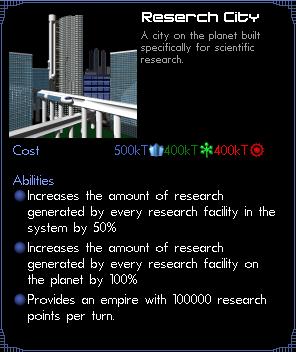Cities- Have you ever wanted to build huge cities on your planet? Well now you can. In this mod there will be five types of cities, each providing huge benefits to those that have taken the time to build them. Cities have long build times(on average 10 years) and high resource cost, but have huge benefits. Cities are specialized to provide only advantages in their specific area, ei Intelligence cities provide a huge increase in intelligence generation. The only limit to city construction is the facility limit for the planet. You can have an entire planet that is nothing but cities if you wanted to. The cities portion of this mod has been completed, and all five cities have been beta tested and work well.