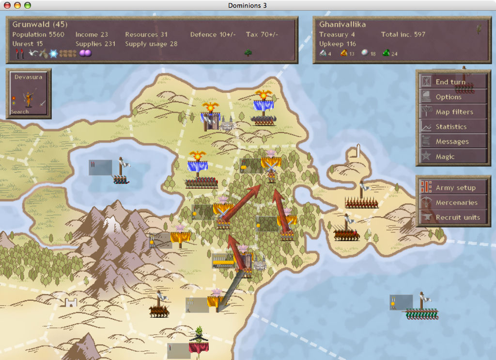 Took the province from Caelum easily. Unfortunately they didn't attack the province I wanted them to, but instead the one I captured last turn. They have in their employ another mercenary band. This turn I will attack from two sides: both Devasura and the new group that Divya is bringing up from the capital.