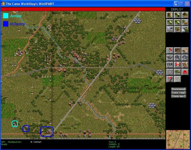 Terrain: Map = 100x100. Lightly wooded terrain with a few low hills. Some single tree hexes does not block LOS. There is one stream running from northwest to southeast. The map is relatively busy with roads. Two roads run from the east to west across the map. One is a straight dirt road all the way across within 150m of the south edge. The other is a more centrally located paved road with curves. There is a generally straight railroad extending from the northern edge of the enemy deployment zone to the southern end of the friendly deployment zone. Roughly parallel to this and 2km to the west is a dirt road. It spends most of it's time in the friendly deployment zone and exits the west central edge of the map. Because of the stream and the number of roads, there are seven bridge hexes. There are about a dozen building clusters scattered about the map, most of them between the deployment zones and along roads.