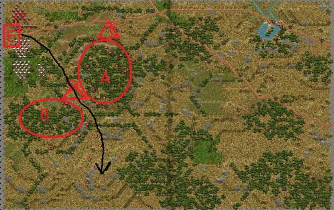I'm still figuring out a defense plan, I'm thinking of establishing a static defense with the Slovak forces (see attached picture). One company will deploy at position A the other at position B. Positions C and D will be the AT defenses with the one at C including an antitank ditch to force any vehicles to go off road. KG Krafft will enter at position E and eventually launch a counterattack along the path of the black line.
