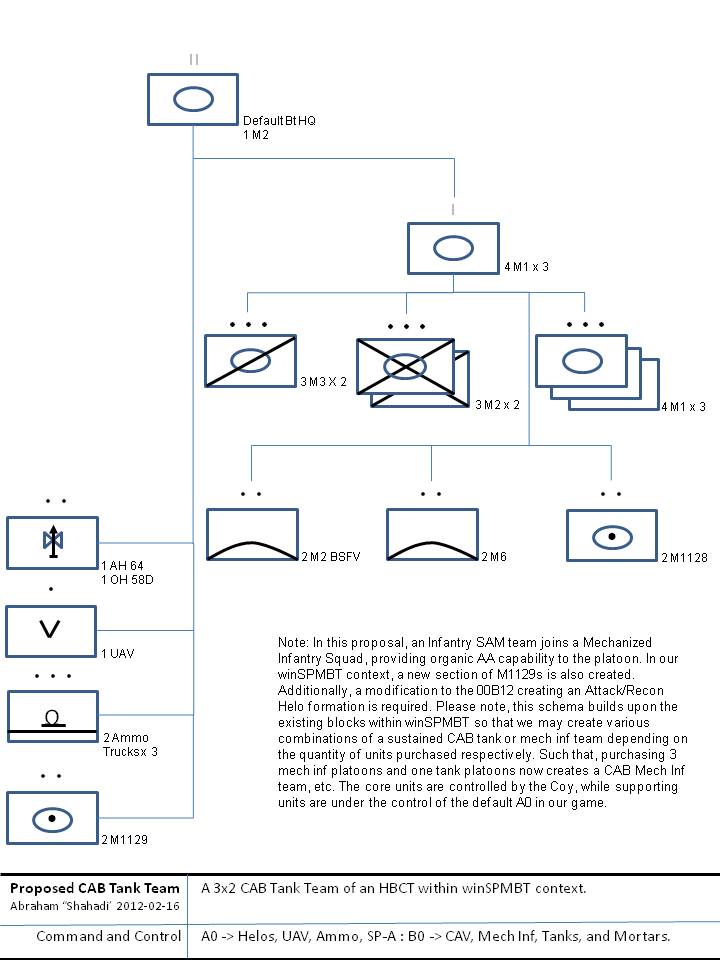 Note: In this proposal, an Infantry SAM team joins a Mechanized Infantry Squad, providing organic AA capability to the platoon. In our winSPMBT context, a new section of M1129s is also created. Additionally, a modification to the 00B12 creating an Attack/Recon Helo formation is required. Please note, this schema builds upon the existing blocks within winSPMBT so that we may create various combinations of an organic sustainable CAB tank or mech inf team. Such that, purchasing 3 mech inf platoons and one tank platoon creates a CAB Mech Inf team, or as represented in the link below, purchasing 3 tank platoon and 2 mech inf platoons creates a tank team, etc.