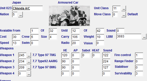 2) The wrong sound F/X was assigned to that from what I can see when it was changed from being a Type 91 So-Mo that had a MG and three rifles assigned ...that was V9 in 2016. I have now corrected that in the master OOB and if you want to change yours you can using this as guide but you will only hear all three if you have preferences animation level set to full on but if you do you will hear all three firing instead of the rifle sound and it will take effect when you start that game again