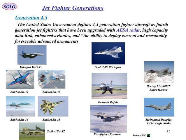 The last two posts were meant to provide a general overview of the issues I'm looking at. I'll offer one more example from Russia. The best operational frontline fighter they have operating at this moment is the Su-35 (This by the way is the fighter chosen for mass production over the PAF FA/T-50 due to it's operational and financial difficulties. They have or soon will have, 12 operational for IOP in a Squadron.), it's EW is rated @ 10. The MiG-29SM EW is rated @ 9. And I hope some of you are paying attention to this because the Su-100 is rated at 0!?!