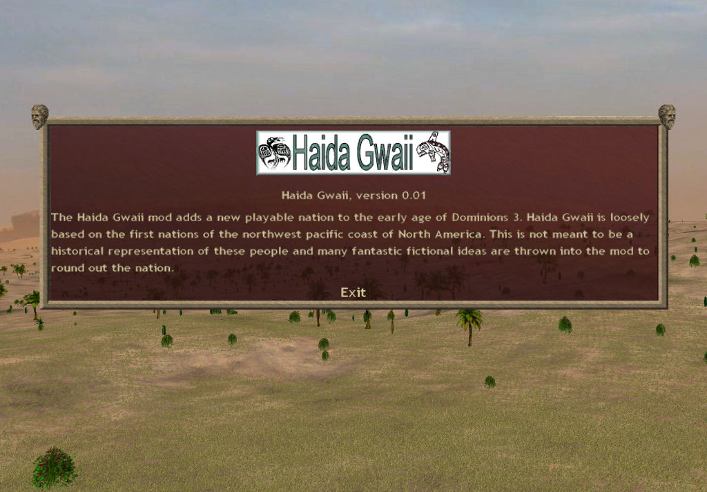 I am currently working on a mod for Dominions 3 titled "Haida Gwaii". This mod is loosely based on the First Nations of the Pacific Northwest. These nations include the Haida, Tlinget and Tsimshian cultures that lived between the Washington state area to as far north as Alaska.