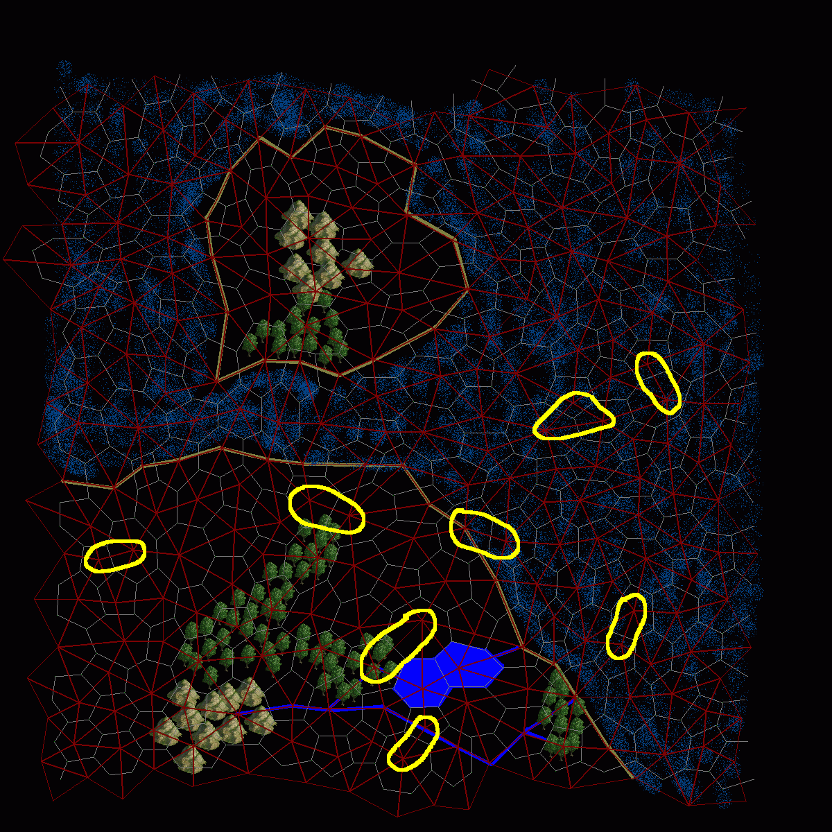 those regions are not necessarily provinces, they are meant to be the building blocks of the provinces. im thinking that province edges could be either the gray or red lines, depending on the terrain that has been placed. but im pretty sure that im sticking to rivers on the triangle edges, using the others would make it too chaotic. and yes, getting the delaunay triangulation to wrap was rough.