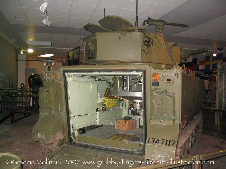 As you can clearly see the middle is naturally enough the gunners position and turret mechanics. The seats are left and right and are taken up by not surprisingly ammo. In some pictures the space closest to the door and to the right actually has a seat belt. I'm assuming it is for the loader. Doesn't look like there is any room in there for anyone extra except maybe a casualty lying on the deck close to the door.