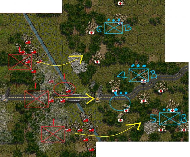 B coy's position has somewhat stabilised. The enemy is taking a long time to re-org before coming out from the woods. In the mean time, they have detached Pl 6 to march towards A coy's sector. Our Armour pl is also moving towards A coy's sector, after they complete their resupply.