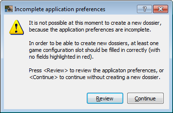 The new Warning when trying to create a new dossier while the Preferences are still incomplete: