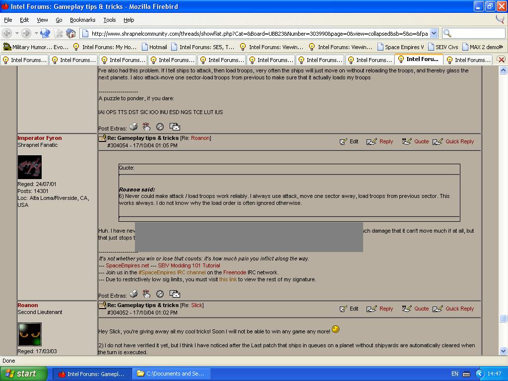 I know Firefox is better, but this is not my own PC. My own PC has no internet, so I'm reliant on an account on this computer for Internet (i.e. forum, 92% of the time, Schlock Mercenary 7% of the time, rest 1% of the time) access. And I don't know if Alneyan uses Firebird, Forefox, IE, Netscape, a hypernet node, or whatever. But if he sees them too...