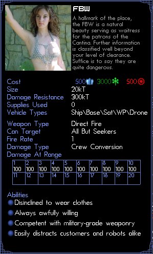 Let's see if my "Knowledge of the Denizens of the Cantina" serves me well. FBW is likely to mean something like "Beautiful Women", as it is a hallmark of their bartenders, along with "being willing at all times". Odd place this Cantina is. Truly odd. Alternatively, it could just mean "Fantastic Bar Waitress", or something of the like. But their characteristics remain the same regardless of what FBW actually means.