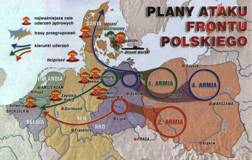 In plan 1-th army should be transported to DDR at lanuch atack from western Maklenburgy in the direction of Hamburg and Schleswig-Holstein. After two/three days poles schould destroy a Northern Jutland NATO Corps and went to the Elba(Laba) river and German-Denmark border. In secound phase polish 1-th army crosing Elba river and throught the plateau of lover Saksony schuld atack to the line of Rhine river and Holland. After that new tragets to atack should be mark by Warsaw pact command.