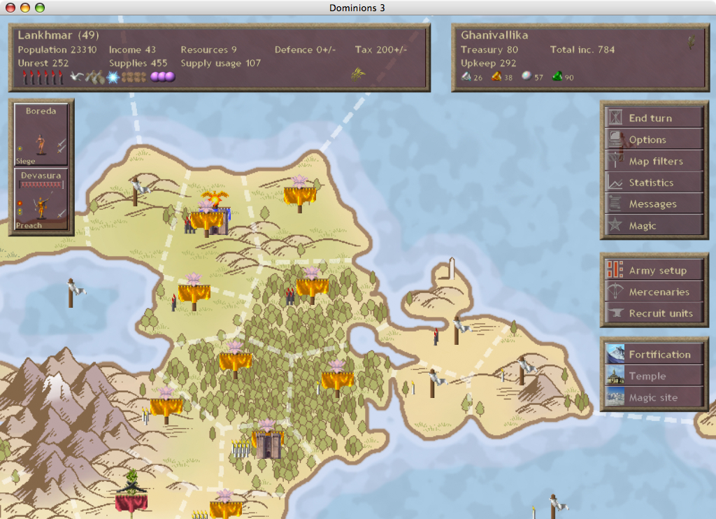 Everything Quiet. Ananda built a temple, and immediately the devotion to the false god of Caelum went down in the province. Devasura is continuing to preach but has not yet swayed public opinion decisively, even though unrest is very high. Asisa has arrived on the front line and is deploying her troops and searching for magic sites. The next few turns are playing the waiting game - building temples and preaching, and watching my dominion slowly grow. After this I will turn my attention to T'ien Ch'i.
