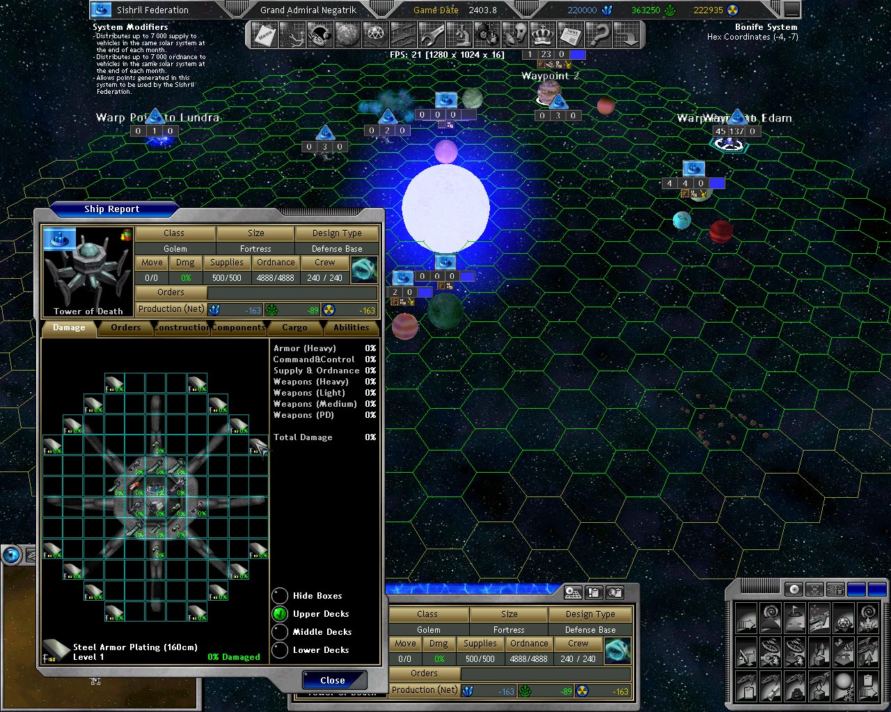 As I said already IMO the real limitation is the hardware/computer resources SE V needs in a larger/advanced game. My system (Athlon 3400+, 512MB RAM, Nividia GeForce FX 5500) may not be the newest, but is far above the published system requirements. And in a game at stardate 2412.0 with about 70 systems and 18 empires a game turn processing lasts several minutes. Even changing the system display or some larger lists may take a few seconds. Compared to SE IV this is a huge difference on my computer.