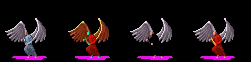 This image shows the three parts that form the final image, and the final image. The leftmost is the original layer, which is actually the only one that has the black background and the magenta shadow. The one next to it is the color-edited seraph, whose wings and hands are replaced by the third image. The last sprite of the jpg is the final one, with the dagger also changed. I left the dagger layer out.