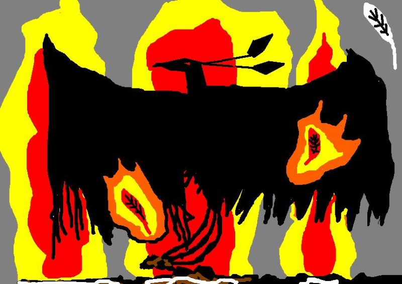 While your pictures aren't something that could be used in the game straigth away, the silhouette-like look gave me an idea. Attached are three different versions of a phoenix. They are named as blackphoenix.tga and blackphoenix2.tga, blackphoenix_aflame.tga and blackphoenix_alfame2.tga, and blackphoenix_flames.tga and blackphoenix_flames2.tga. The first pair is just a recolored version of Harpy Queen hero of Pangaea, in the second and third there are flames made from Djinni (of the lamp) and a Fire Elemental behind the same sprite. All first sprites consist of just a shadow, while all second sprites are colored as if flaming, but in the exact form of the shadow of the first sprite.