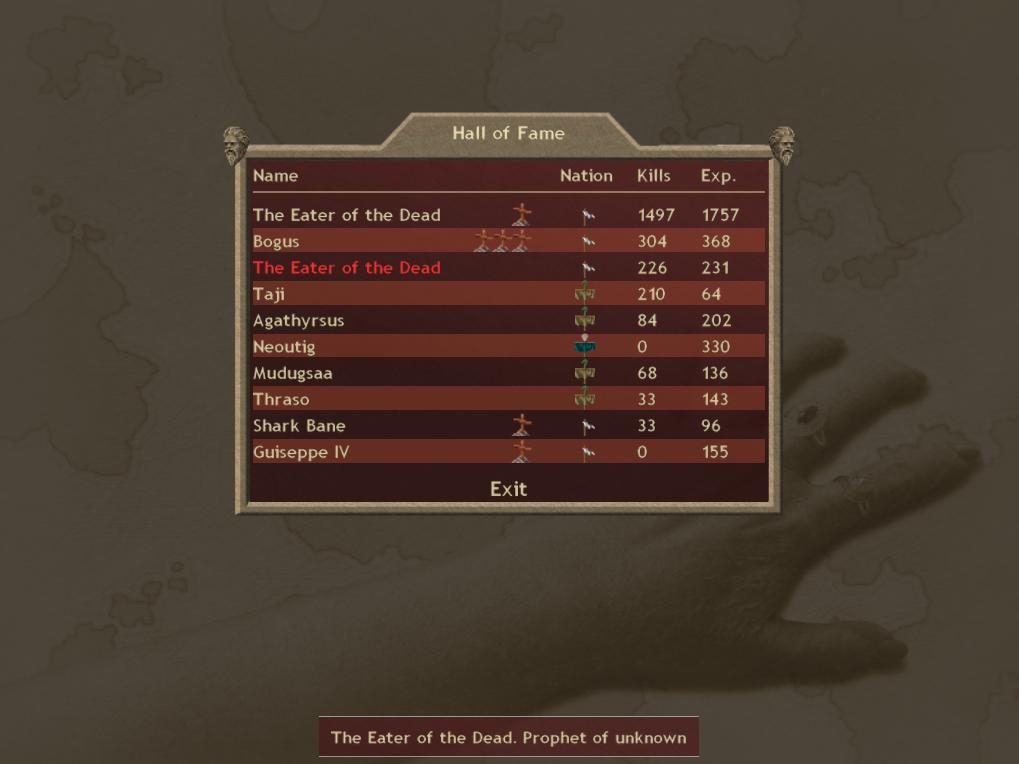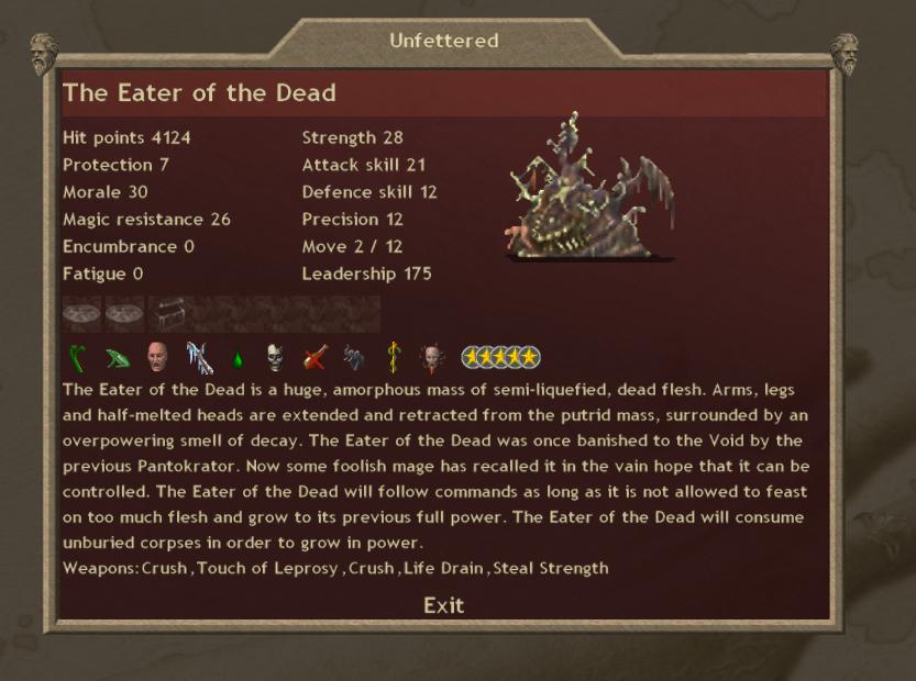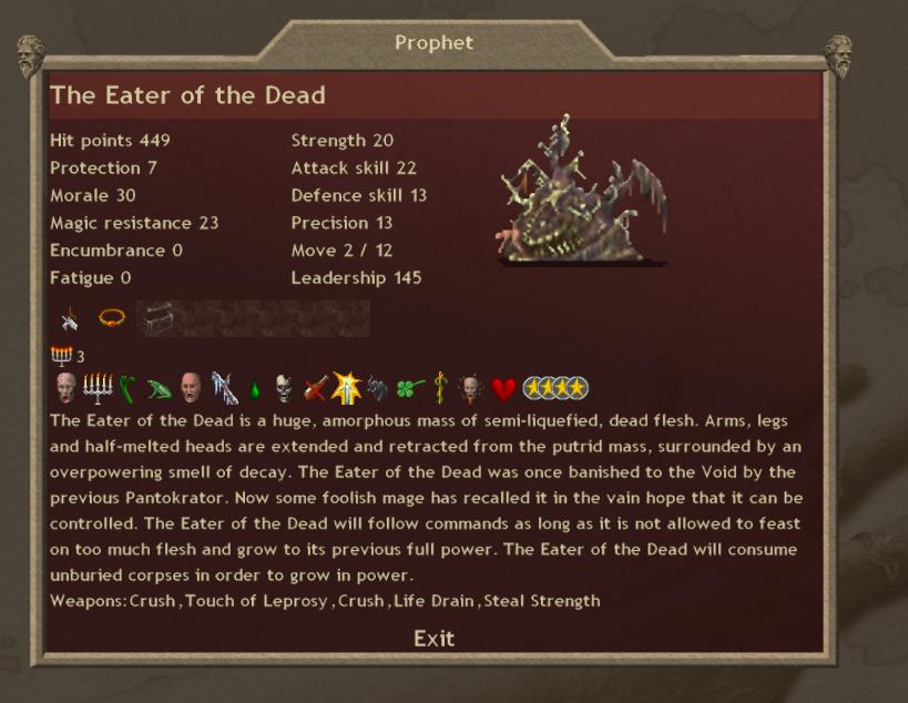 I've found a funny bug. Was playing around with the Eater of the Dead. I have cast GoR on him, gave pedant of luck and ring of regeneration, made him a prophet, fed him to the 3rd form and pushed him deep into enemy territory. He quickly made himself to the 1st place in the hall of fame, then, as usual, he became uncontrollable and started rampaging random provinces. The icon in the hall of fame was showing he was dead, so I had cast a Ritual of Rebirh, AND the SECOND INDEPANDANT Eater with items and prophet status has appeared in the province first one has gone berserk in. Now there are 2 Eaters stalking around. That's not all. There's supposed to be only one Eater in the world, and when you resummon it the independant one dissapears, so I was eager to know wich one would dissapear, or would they dissapear both... So I've cast Call the Eater again... To my surpise - none of them did, and I've received the third one.
