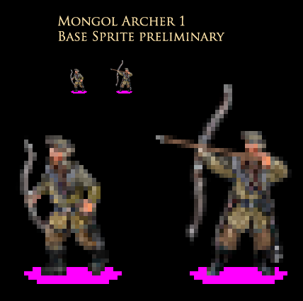 Well, I can't promise fast work, but here is Mongol archer 1 for preliminary review. Feel free to make demands -- how does it match the concept? More armor? Change the whole shirt to metallic color? Hat too big? Want me to find a way to put a more prominent spike on top? I know you mentioned axe and buckler before, and I can tack those on, but here is a base unit. Again, most work done, but not yet finalized (i.e., I haven't looked at it in game and gotten rid of the inevitable dark edges and artifacts).
