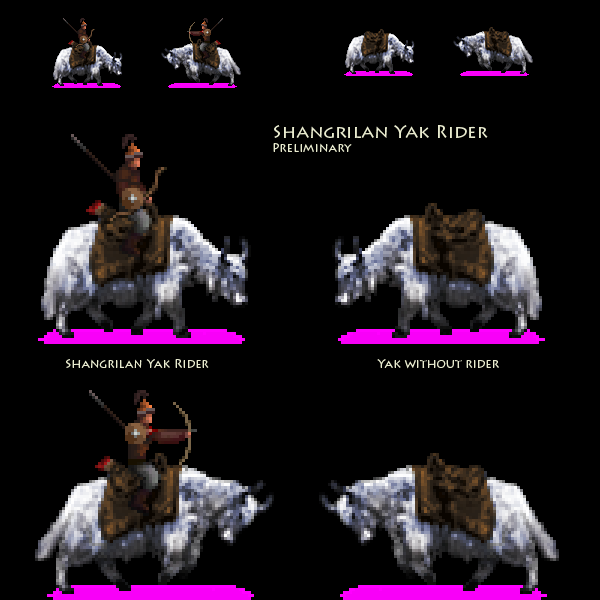 I was looking over a few sprites and cleaning up ones with noticeable problems, when I realized that the creature the yak rider is riding is not actually a yak. And the riders are Furthermore, the rider seems like a fairly generic unit not in keeping with the style of the other Bhodpa units.