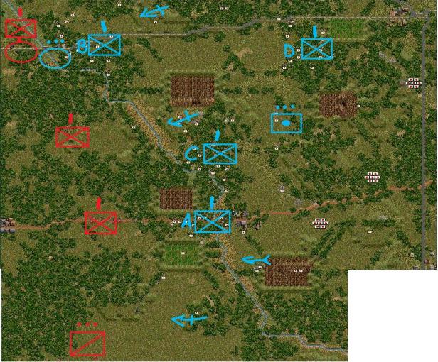 A Coy is currently pulling behind into the trees, after successfully destroying a light enemy armour section. They will continue to delay infront of the Wooden Bridge. An enemy coy is observed to be headed its way and a motorcycle platoon on its flank to the south.