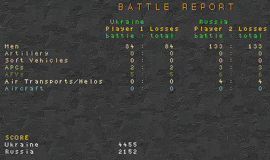 I played as Ukraine v. Russia, but accidentally saved over it, so I don't have the results. I did have my *ss handed to me by the Russians by turn 9, however, but managed to kill a lot of their tanks and helos.