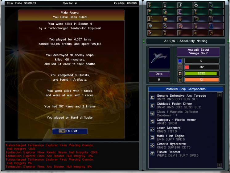 Fracking friendly Linguine heavy warship follows me into an asteroid field shooting me because I'm too close. EVERY DAMN STEP I take it mirrors and continues to shoot. As far as deaths go, this has been the most aggravating doubly so because I wasn't doing anything wrong, the game just decided to murder my best run yet.