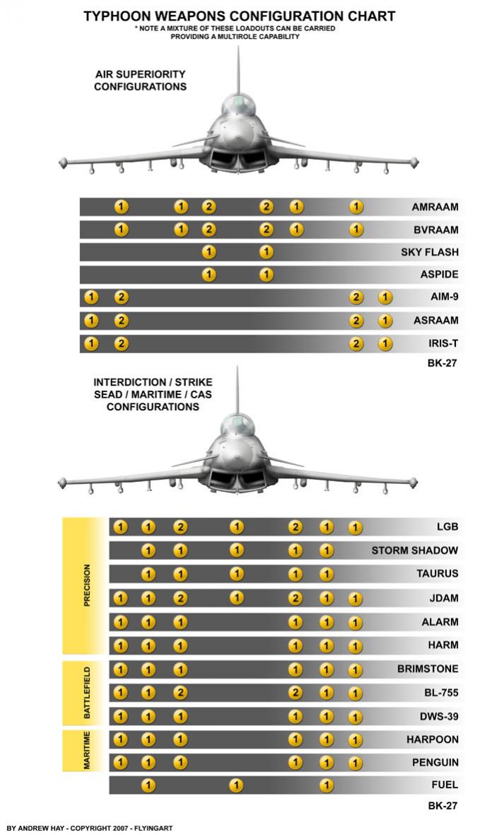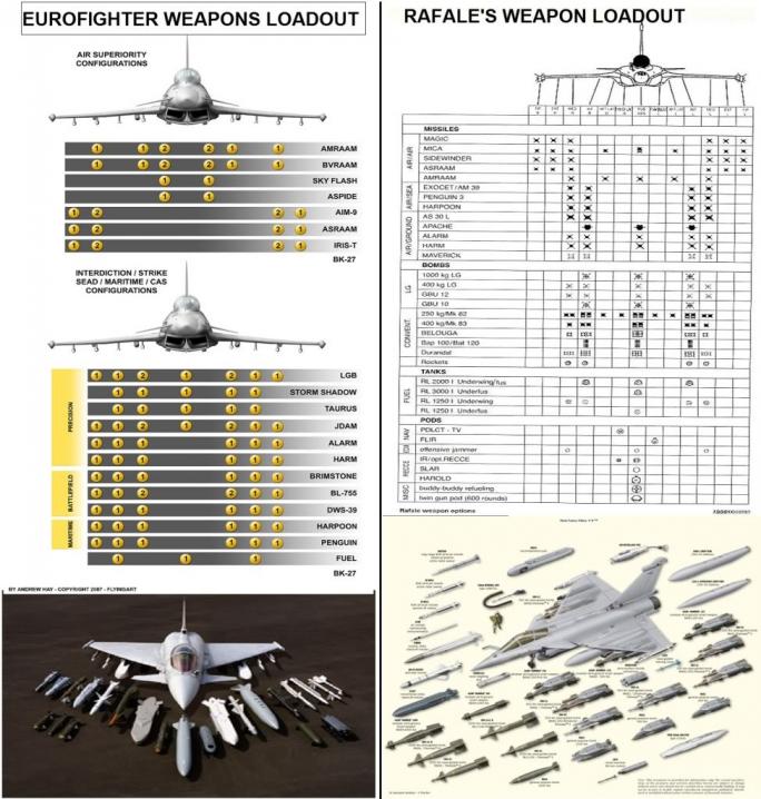 I'm not sure of the confusion, I'm merely pointing an aircraft's progression is tied into technological advances across the board to include avionics (Non factor in our game.), electronics (EW, Vision) and weapons. The RAF has not let you down many of the TYPHOON T2/T3 improvements dealt specifically with it's fighter-bomber capabilities some were weapons and others sensor driven (Which means software updates etc. etc.). What I really didn't pay attention to is it's SEAD role it appears to be highly capable of that mission as well. Because I won't pay ADOBE for certain services, I can't extract the data I wanted off their (Eurofighter) PDF download of technical data. However I found the same charts on line for the TYPHOON's various weapons configurations. The comparison picture of the side by side weapons configurations of the TYPHOON and RAFALE are from a different source but very useful none the less.